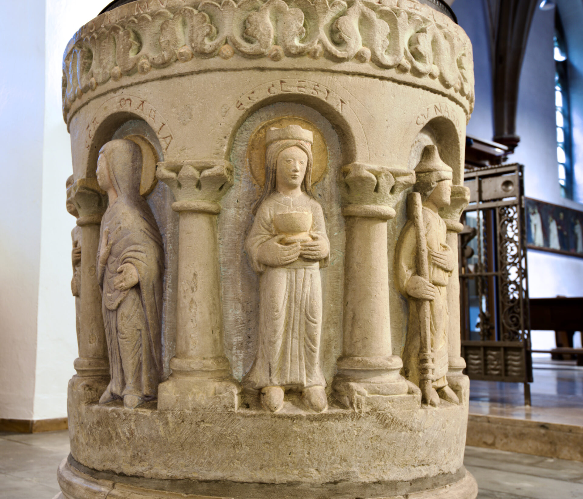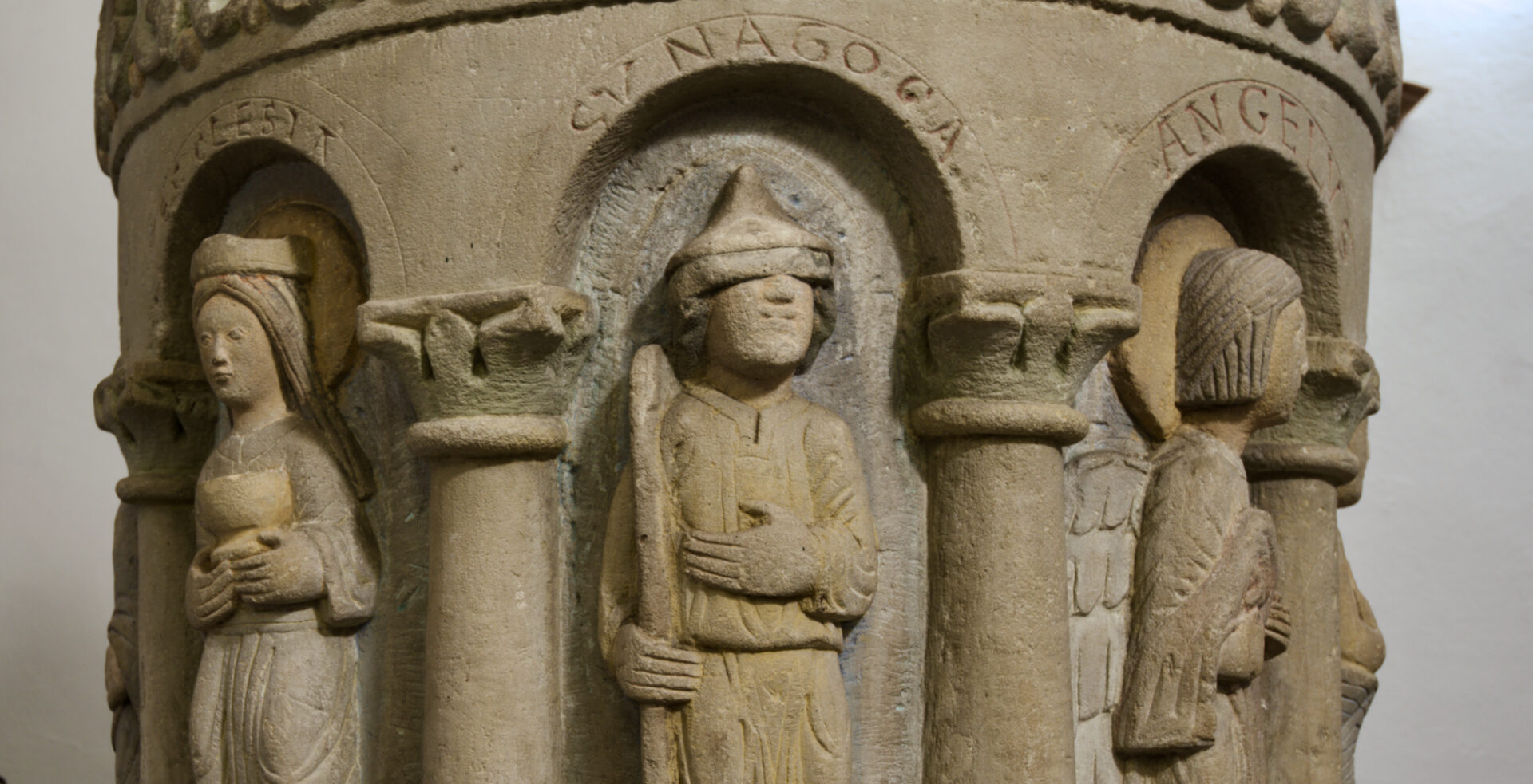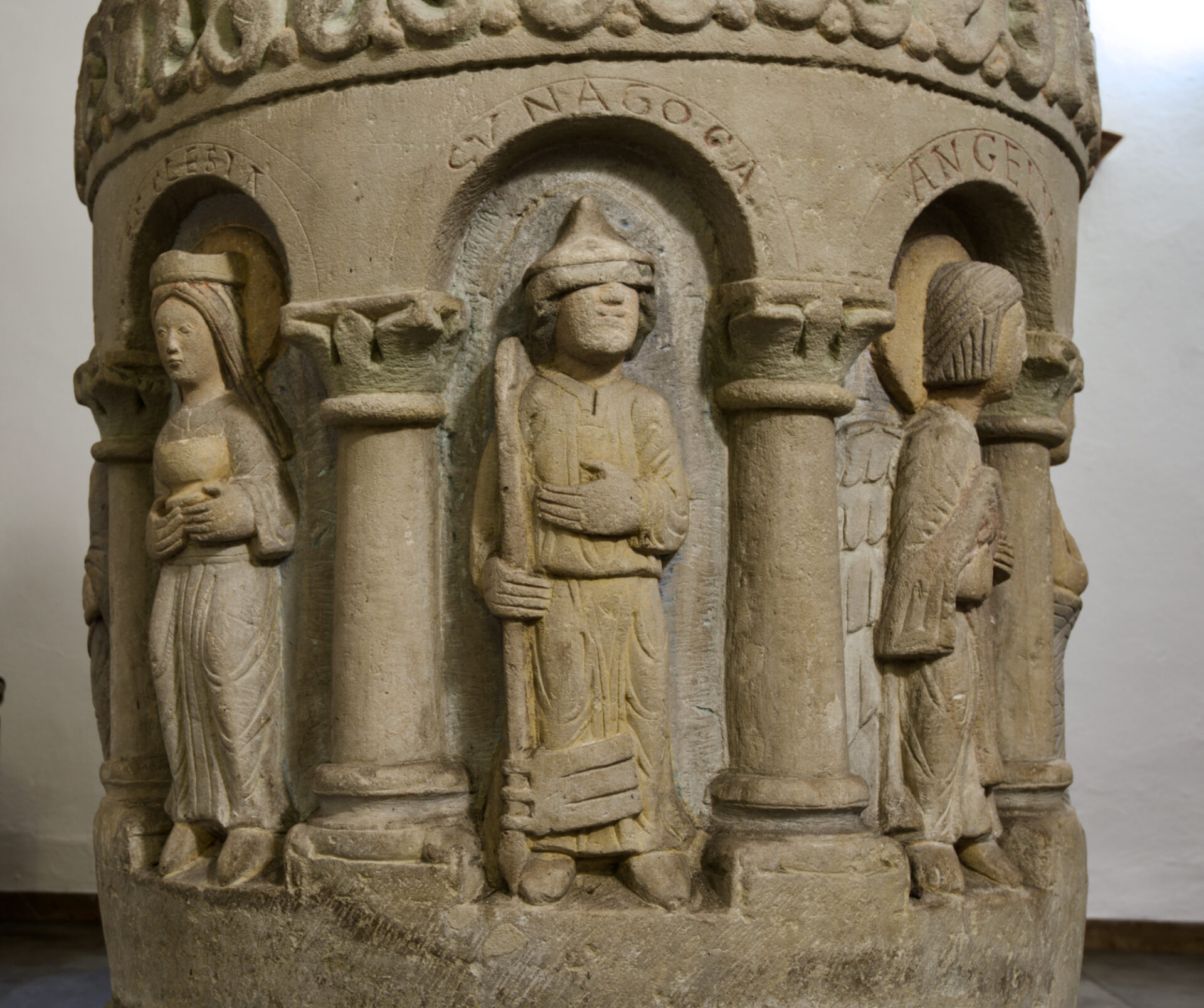 In der römisch-katholischen Pfarrkirche St. Pankratius in Beckum (Vellern), deren Ursprünge ins 12. Jahrhundert zurückreichen, befindet sich ein Taufstein, der auf die Mitte des 13. Jahrhunderts datiert wird .1 Dieser Taufstein zeigt in acht Reliefdarstellungen figürliche Motive, unter denen sich auch ein besonders prägnantes allegorisches Paar befindet: die Ecclesia und die Synagoga. Beide Figuren sind nicht nur durch ihre Attribute, sondern auch durch die über ihnen angebrachten Inschriften eindeutig zu identifizieren. Reproduziert wird durch diese Figuren christliche Judenfeindschaft in Form von Überlegenheitsphantasien gegenüber dem Judentum.